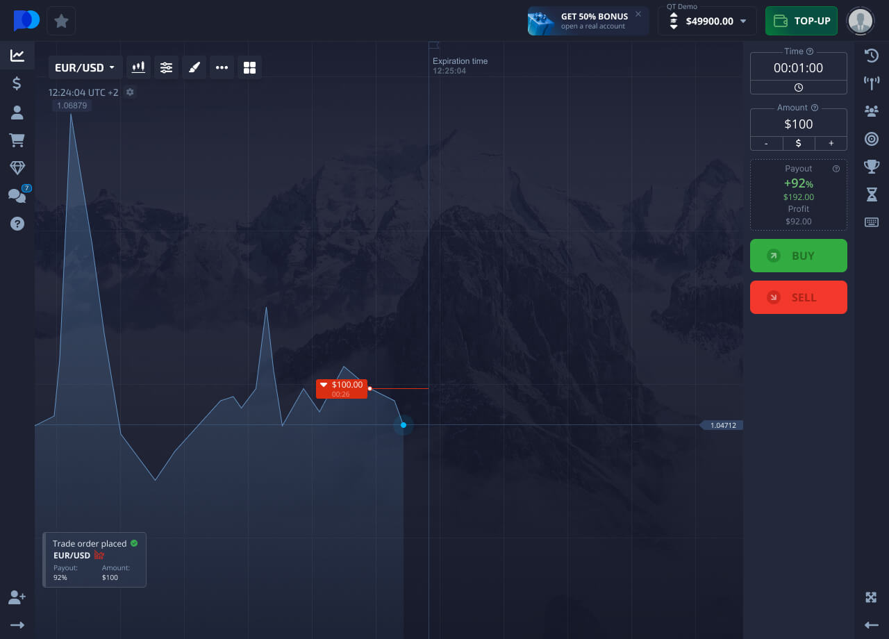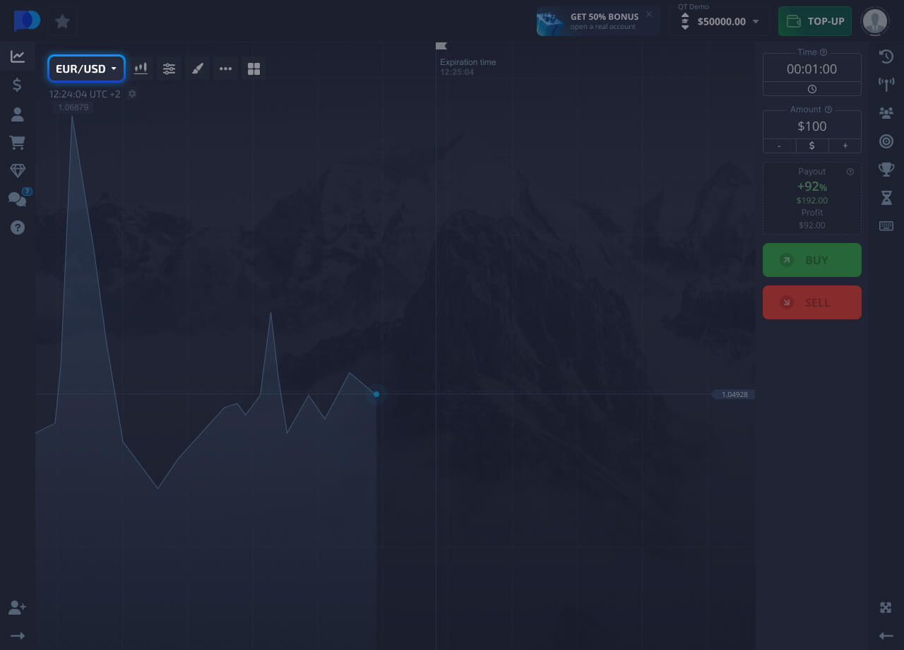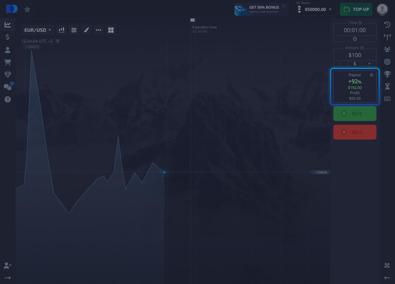 このチャートはアセットの価格がどのように変化しているかを示しています。予測をする必要があります:ある期間に価格の方向がどのように変化するかを予測し、予測に従って購入または売却をクリックしてください。