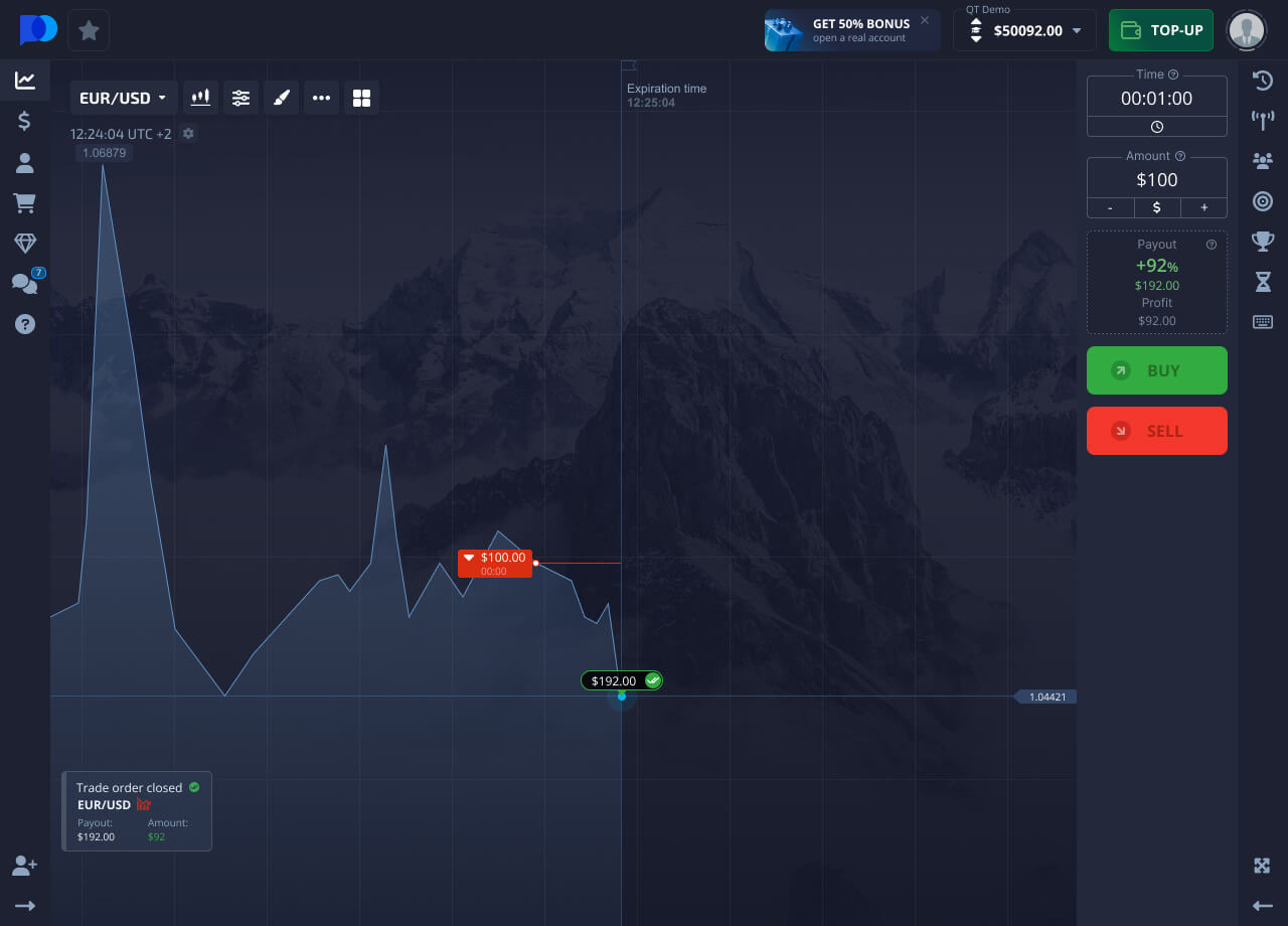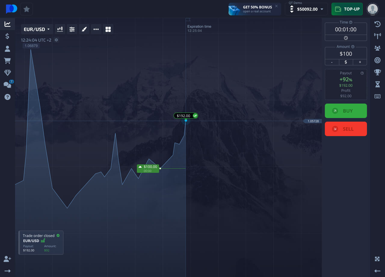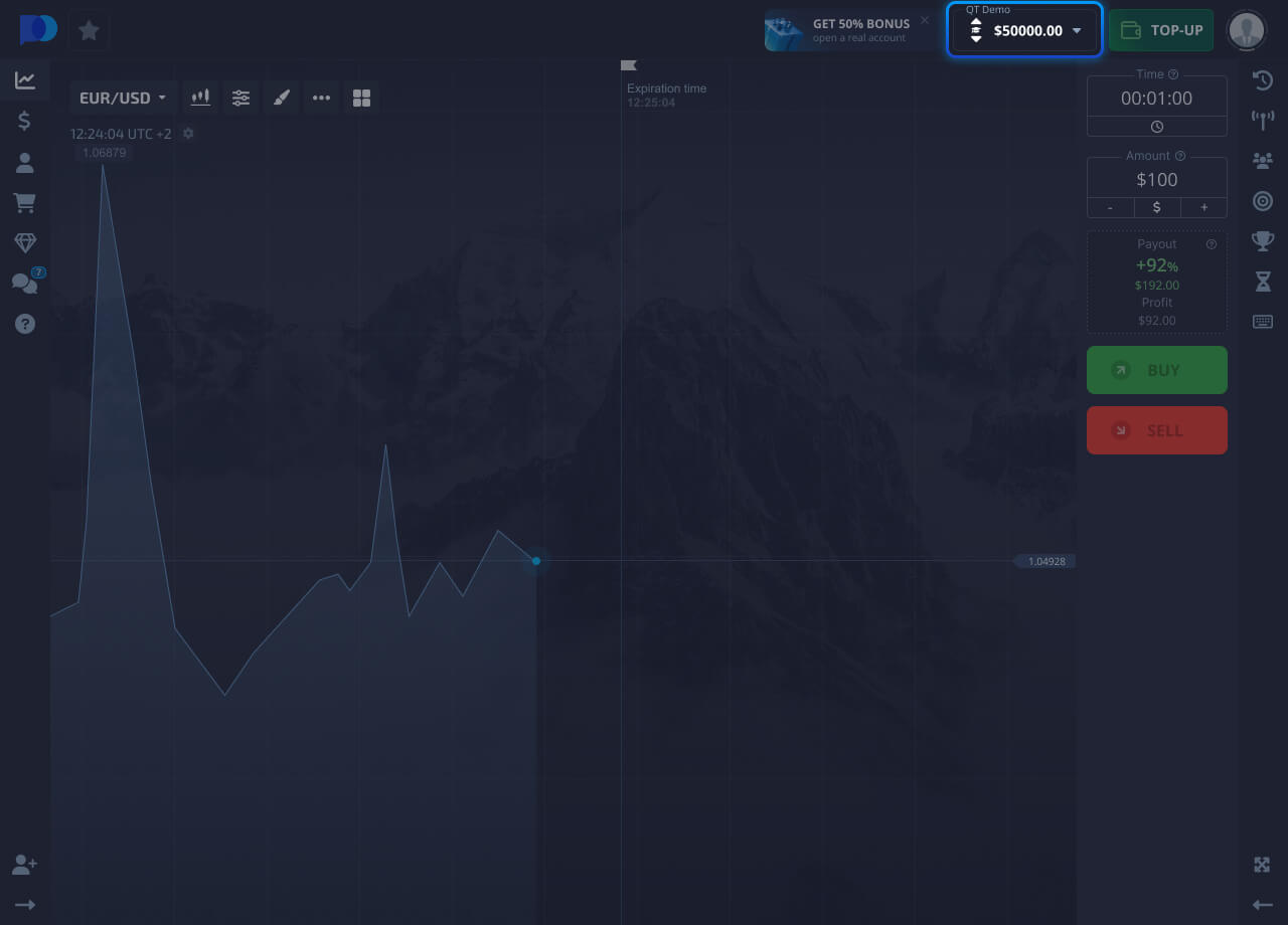 このチャートはアセットの価格がどのように変化しているかを示しています。予測をする必要があります:ある期間に価格の方向がどのように変化するかを予測し、予測に従って購入または売却をクリックしてください。