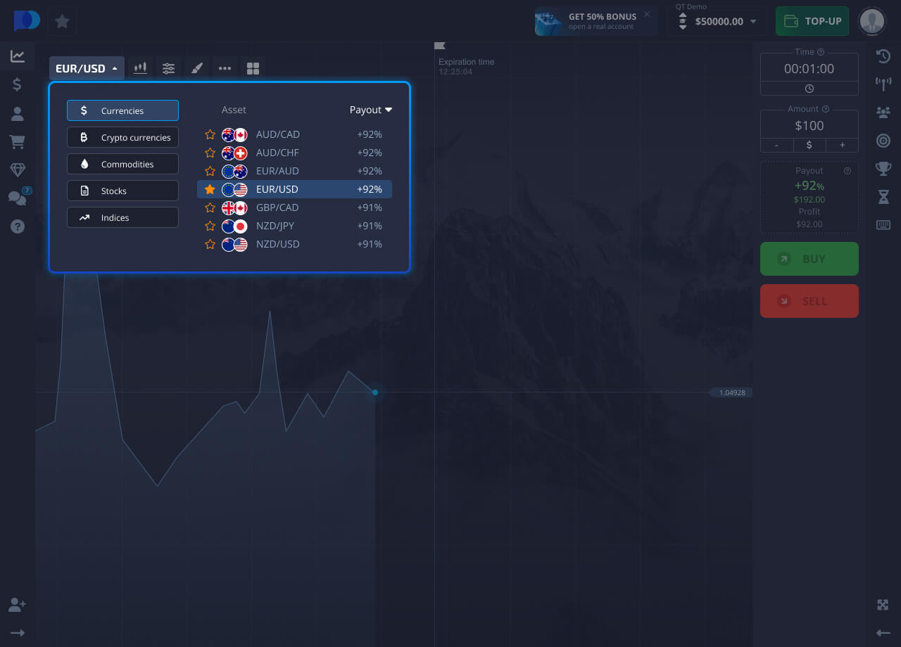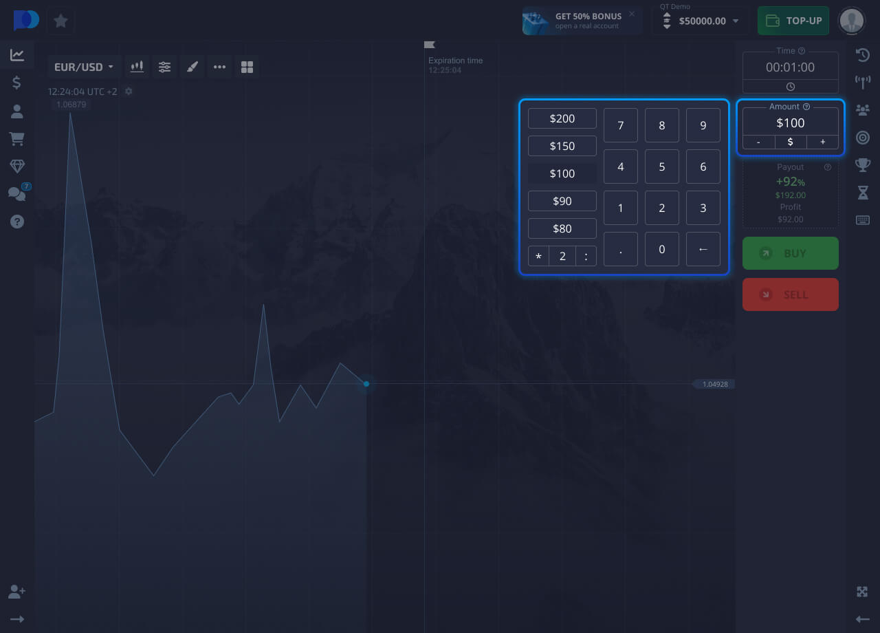 アセットの価格が上昇すると思うか下降すると思うかに従って購入または売却のボタンをクリックしてください。